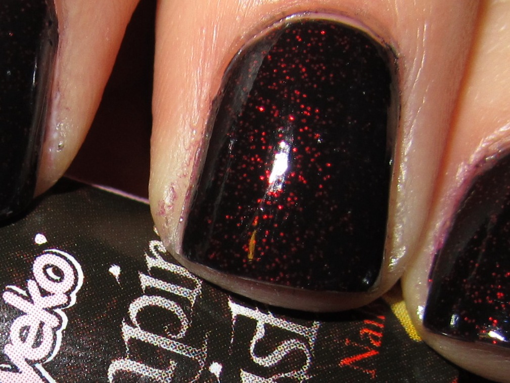Oja inca nu o pot testa, ca sunt data cu altceva, asa ca nu pot zice cat rezista, cum e, cate straturi, etc. O sa revin probabil. Un mic downside totusi, e micutza ( 8.5 ml). Pentru mine asta nu-i problema, ca eu oricum folosesc multe oje si se consuma greu. E un fel de negru, cu glitter rosu. Eu zic ca e interesanta, si abia astept sa o incerc. Poza cu flash, in incercarea de a prinde glitterul.